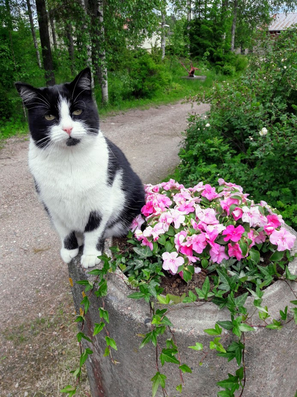 Päivänliljatkin kukkivat "purppurailta" kukkapenkin vieressä, vaikka mustavalkoinen möttiäinen on kovasti yrittänyt sapotoida niitä. Liljojen katveeseen on mukava piiloutua makoilemaan ja siellä on hyvä vaaniskella leikkisästi ja tehdä yllätys loikkia.
